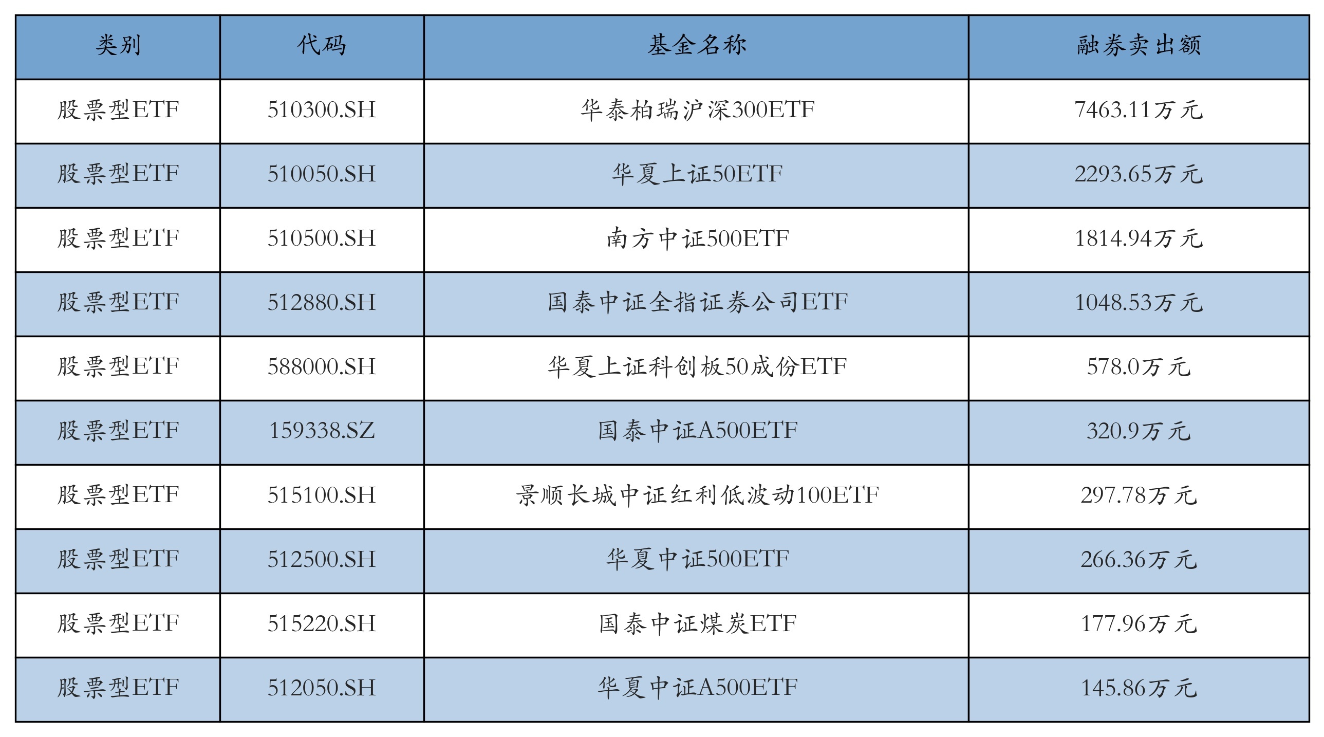 昨日股票型ETF融资卖出额最高的3只ETF及其卖出金额分别为:华泰柏瑞沪深300ETF(7463.11万元)、华夏上证50ETF(2293.65万元)、南方中证500ETF(1814.94万元)。融券卖出额前10详情见下表: