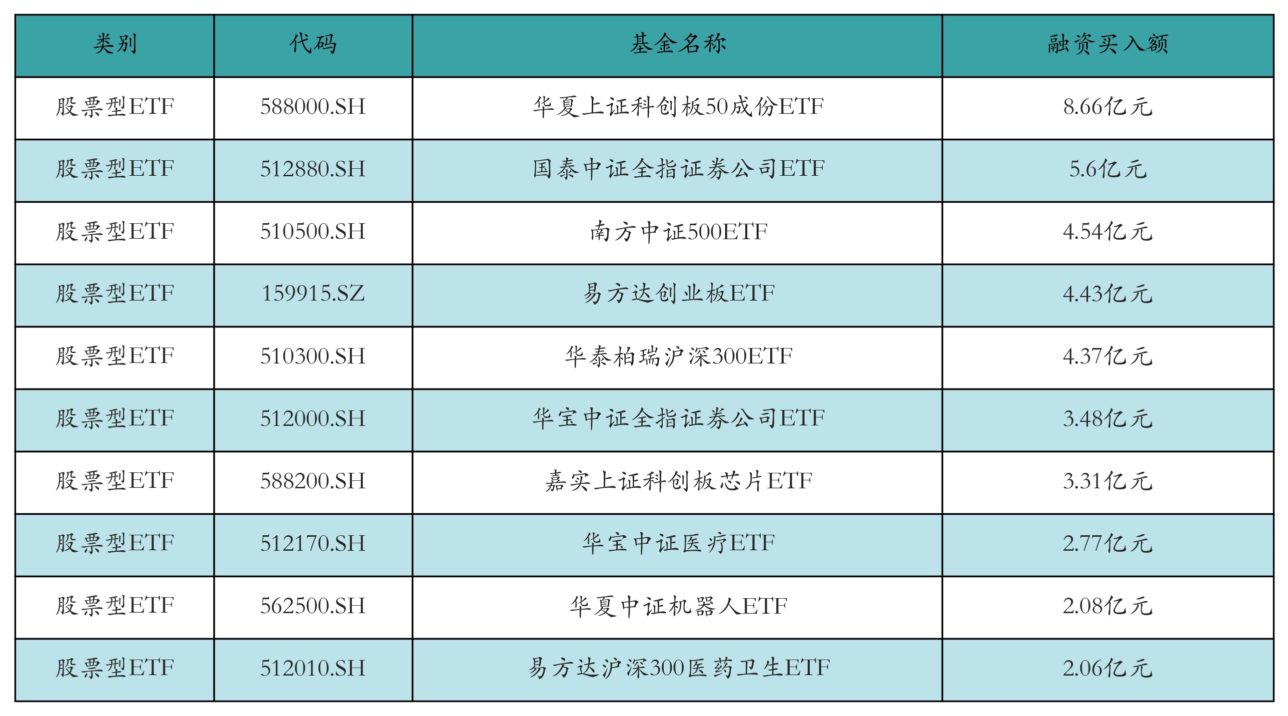 昨日股票型ETF融资买入额最高的3只ETF及其买入金额分别为:华夏上证科创板50成份ETF(8.66亿元)、国泰中证全指证券公司ETF(5.6亿元)、南方中证500ETF(4.54亿元)。融资买入额前10详情见下表: