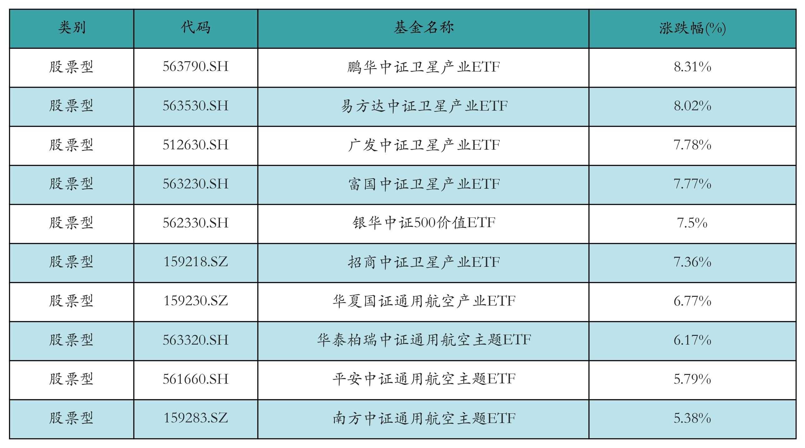 昨日股票型ETF涨幅最高的3只ETF及其收益率分别为:鹏华中证卫星产业ETF(8.31%)、易方达中证卫星产业ETF(8.02%)、广发中证卫星产业ETF(7.78%)。涨幅前10详情见下表: