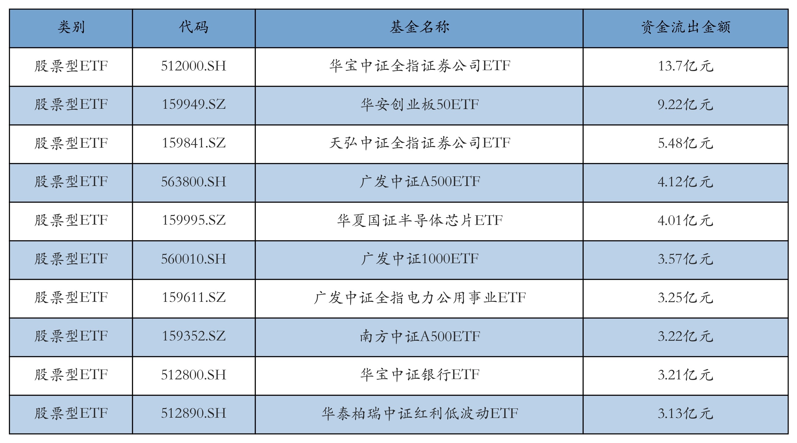 昨日股票型ETF资金流出最多的3只ETF及其流出金额分别为:华宝中证全指证券公司ETF(流出13.7亿元)、华安创业板50ETF(流出9.22亿元)、天弘中证全指证券公司ETF(流出5.48亿元)。资金流出前10详情见下表: