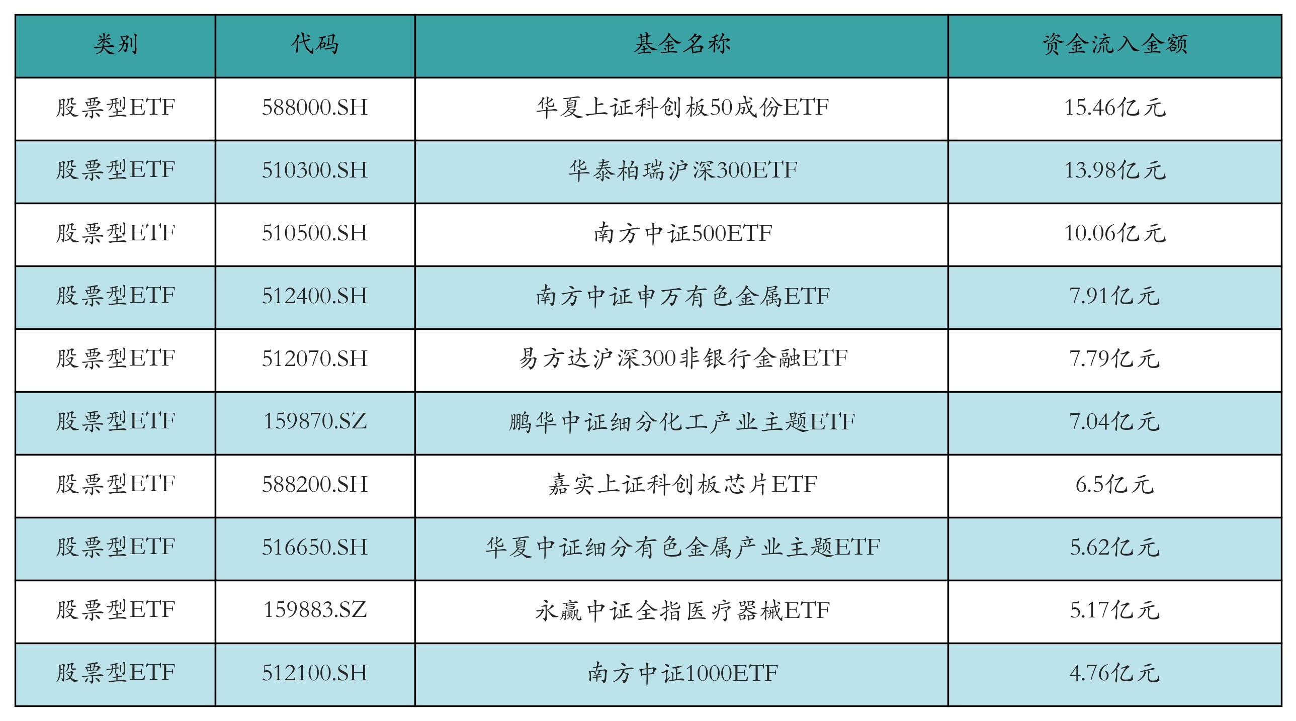 昨日股票型ETF资金流入最多的3只ETF及其流入金额分别为:华夏上证科创板50成份ETF(流入15.46亿元)、华泰柏瑞沪深300ETF(流入13.98亿元)、南方中证500ETF(流入10.06亿元)。资金流入前10详情见下表: