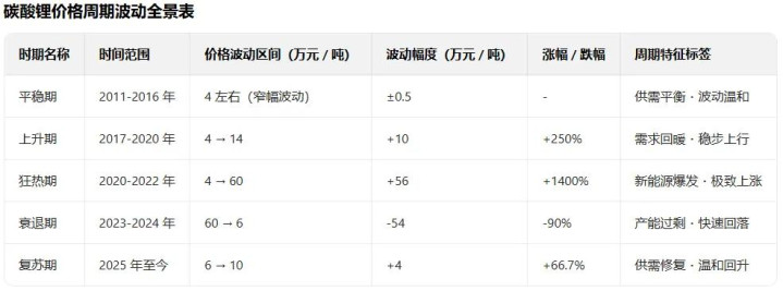 回顾碳酸锂过去十年的价格走势,可以发现清晰的周期规律: